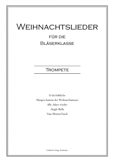 Fünf Weihnachtslieder (O du fröhliche, Morgen kommt der Weihnachtsmann, Alle Jahre wieder, Jingle Bells, Vom Himmel hoch) Einzelstimme für Trompete (beinhaltet die Melodie, eine Begleitstimme, den Text zum Mitsingen und einen einfachen Klaviersatz)